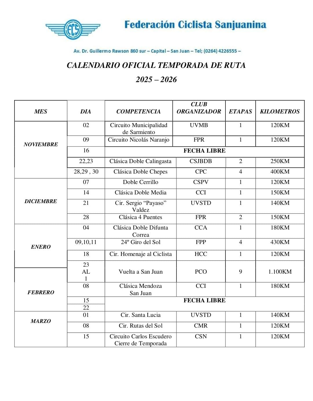 Clásica Doble Calingasta – 2 etapas – 250 KM – Organización: subcomisión de ciclismo de Club Sportivo Juan Bautista Del Bono.