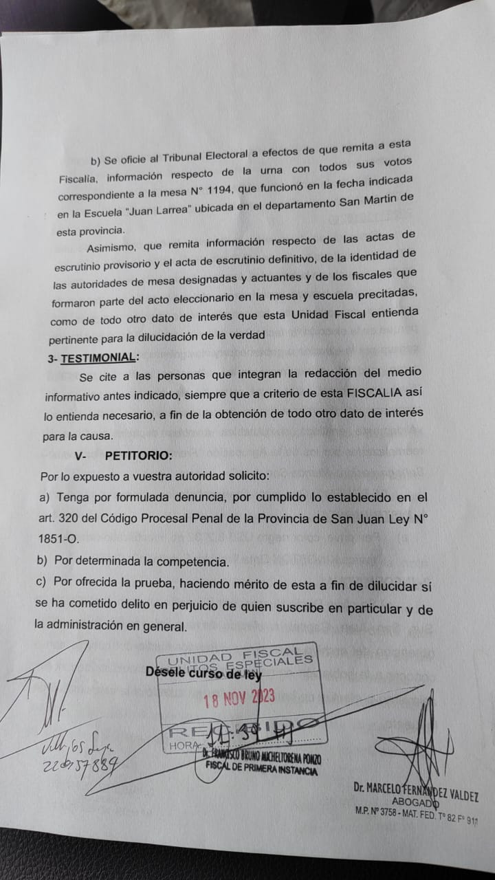III- HECHOS: Que en fecha 16 del corriente mes y año, me impuse del conocimiento de una videograbación casera que hizo público el medio digital “Diario Huarpe”, cuya nota titulada “Elecciones 2023 en San Juan: como robaron votos a Orrego y a candidatos de Milei”, en la sección denominada “Política- Fiscalizacion”, se describe un video que exhibe una serie de maniobras llevadas a cabo por al menos tres personas, de sexo femenino según se logra identificar voces y rasgos físicos, quienes en apariencia según la información aportada por el medio, serian autoridades de mesa que, en el acto eleccionario de fecha 2 de julio del corriente año donde se eligió a candidatos a gobernador y vice gobernador de la provincia, al momento de la apertura de las urnas, fiscalización y contabilización de votos, aparentemente extraían de cada sobre en que los votantes habían introducido votos a video que exhibe una serie de maniobras llevadas a cabo por al menos tres personas, de sexo femenino según se logra identificar voces y rasgos físicos, quienes en apariencia según la información aportada por el medio, serian autoridades de mesa que, en el acto eleccionario de fecha 2 de julio del corriente año donde se eligió a candidatos a gobernador y vice gobernador de la provincia, al momento de la apertura de las urnas, fiscalización y contabilización de votos, aparentemente extraían de cada sobre en que los votantes habían introducido votos a partidos diferentes o distintos a los del Partido “Unión por la Patria” (Rubén Uñac y Cristian Andino) y de manera clara, ingresaban votos de esos candidatos.
