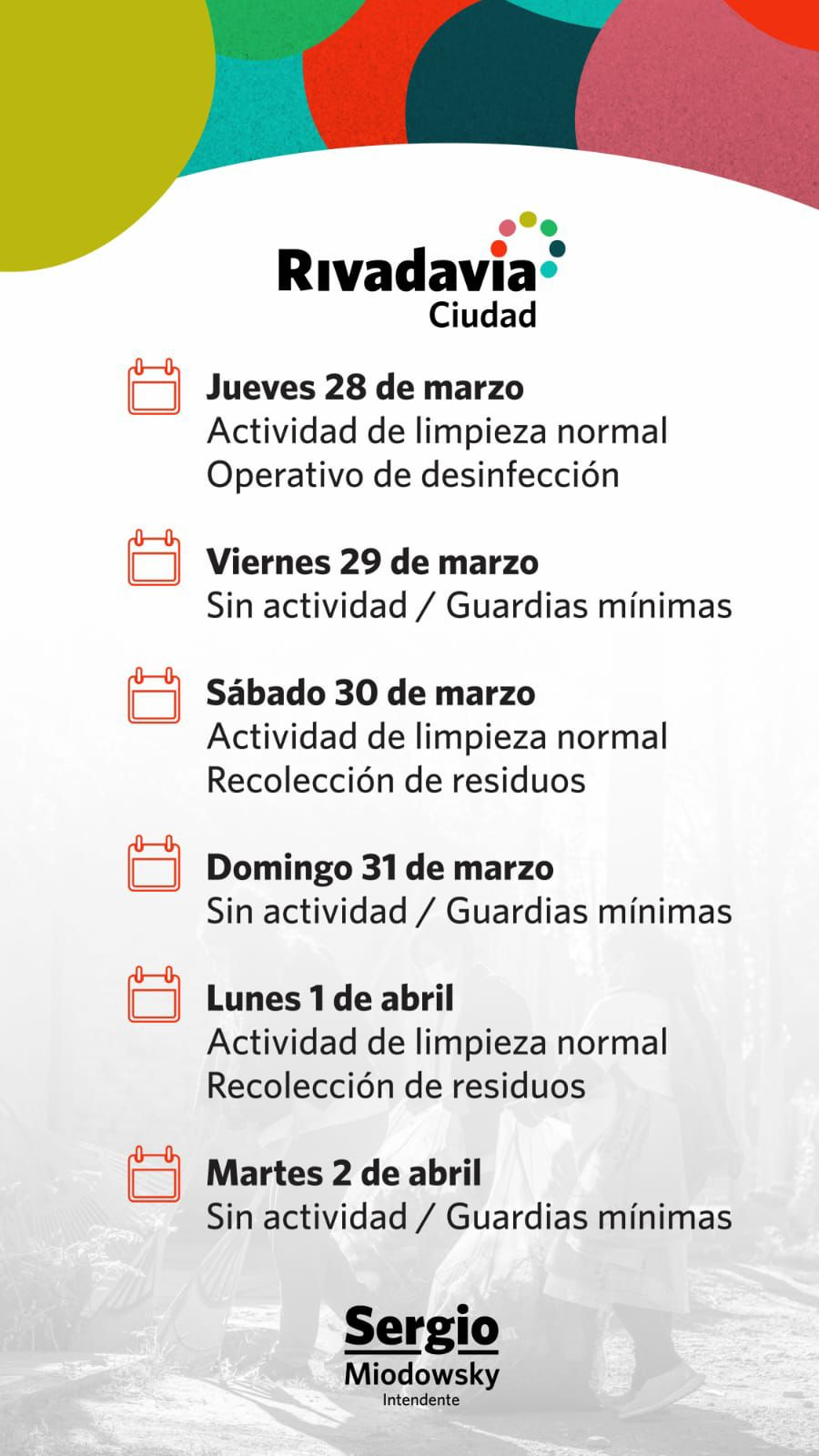 Te cuento cómo funcionarán los servicios en Rivadavia Ciudad este fin de semana largo por la celebración de Semana Santa y los feriados del 1 y 2 de abril.