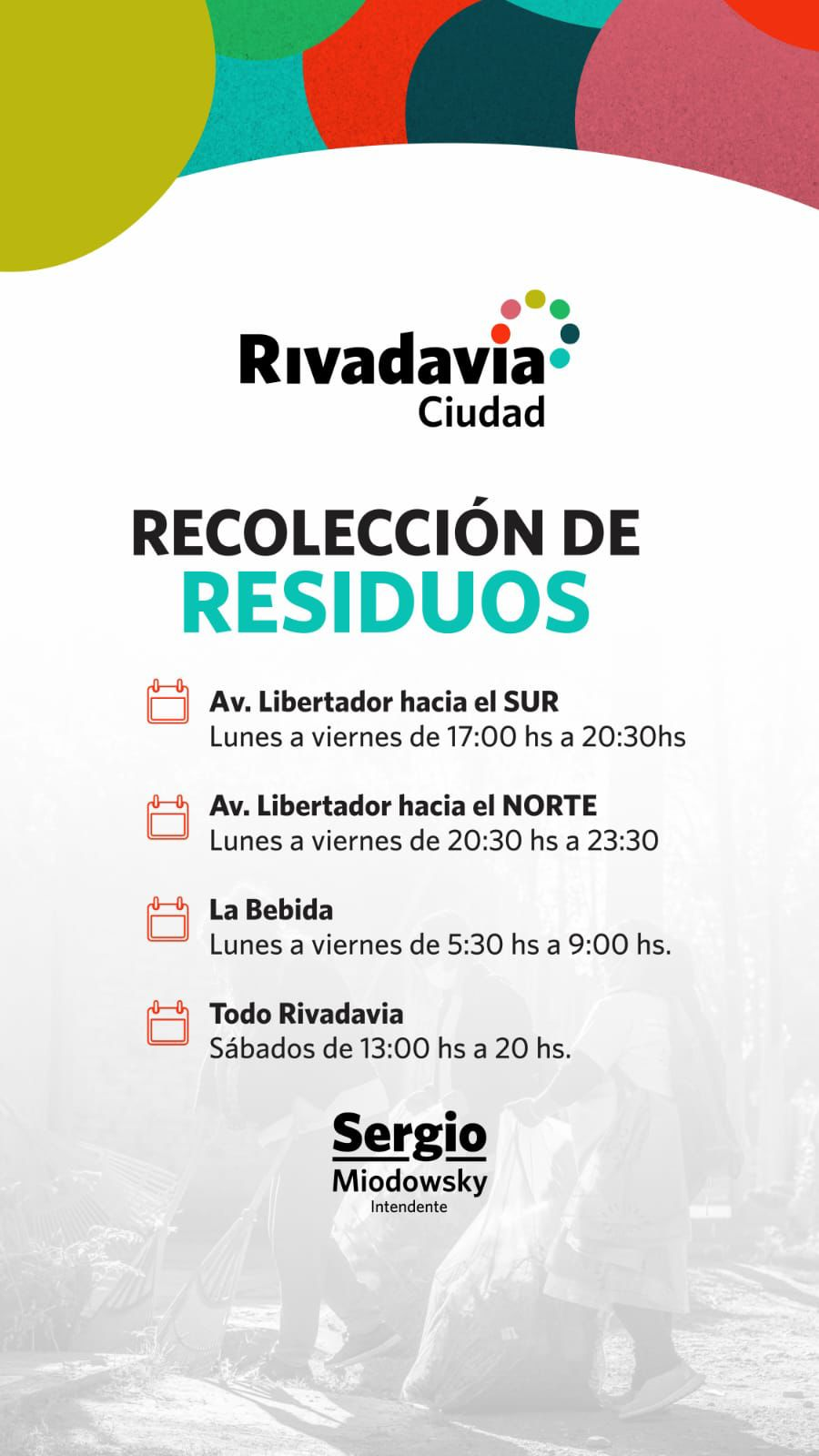 Desde Rivadavia se informa que el recorrido de recolección de residuos del día domingo, pasa al día sábado, manteniendo el horario habitual de 13 a 20 hs.