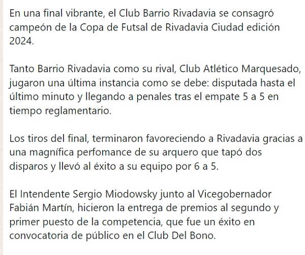 INTERES DEPORTIVO RIVADAVIA Bario Rivadavia es el Campeón de la Copa Rivadavia Futsal 2024 EL REPORTERO 12 de marzo de 2024 Navegación de entradas Anterior: Alertas amarilla y naranja en seis provinciasSiguiente: Primer Foro de Asesoramiento y Colaboración Institucional Más historias INTERES DEPORTIVO Las Escuelas de Iniciación Deportiva con el fútbol como puntapié inicial EDITOR 23 de abril de 2026 RIVADAVIA Rivadavia avanza con más obras: nuevas veredas en Barrio Del Bono Green EL REPORTERO 22 de abril de 2026 RIVADAVIA Celebramos el Mes de la Madre Tierra con una jornada pensada para disfrutar en comunidad EL REPORTERO 21 de abril de 2026