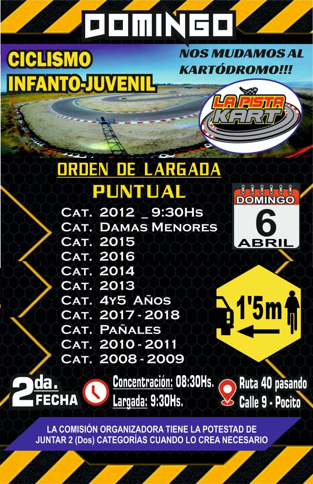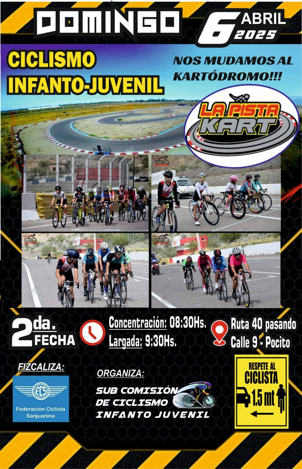 CICLISMO Ciclismo Infanto Juvenil EDITOR 3 de abril de 2025 El próximo domingo se llevará a cabo la segunda fecha del ciclismo Infanto-Juvenil. La sede para las competencias será en el kartódromo «La Pista Kart» ubicado en Ruta 40 y calle 9, en el departamento de Pocito. A continuación, cronograma de actividades: Navegación de entradas Anterior: Advertencia a deportistas por prácticas de tiro del Ejército Argentino en cercanías de El Pinar y Parque FaunísticoSiguiente: Recolección de escombros en Pocito Más historias CICLISMO Selección Sanjuanina se destacó en el Campeonato Argentino de ciclismo en ruta 2026 EDITOR 19 de abril de 2026 CICLISMO Vuelta a San Juan Damas 2026: información del Prólogo EDITOR 3 de marzo de 2026 CICLISMO Tomás Contte es el nuevo líder de la Vuelta a San Juan EL REPORTERO 28 de enero de 2026