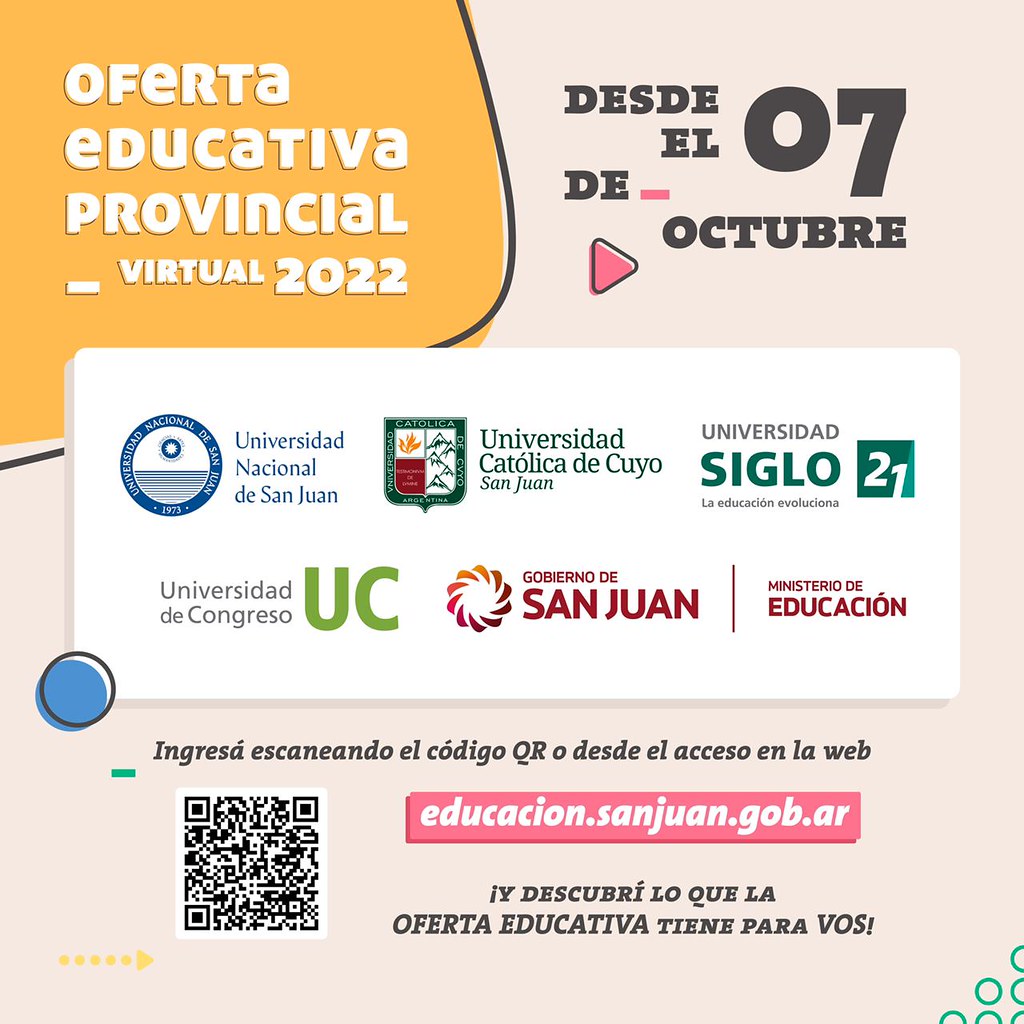 A partir de este viernes 7 de octubre los alumnos podrán conocer las diversas propuestas de las carreras de Nivel Superior y universitarias que se cursan en forma presencial o virtual en la provincia. El Ministerio de Educación, a través de Educación Superior, junto a las universidades Nacional de San Juan, Católica de Cuyo, de Congreso y Siglo XXI ponen a disposición a través de sus plataformas digitales todas las carreras y planes de estudio de gestión estatal o privada, a las que pueden acceder los estudiantes que egresan del secundario o ciudadanos interesados.