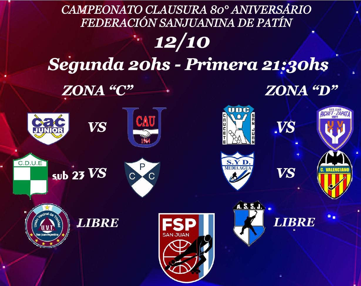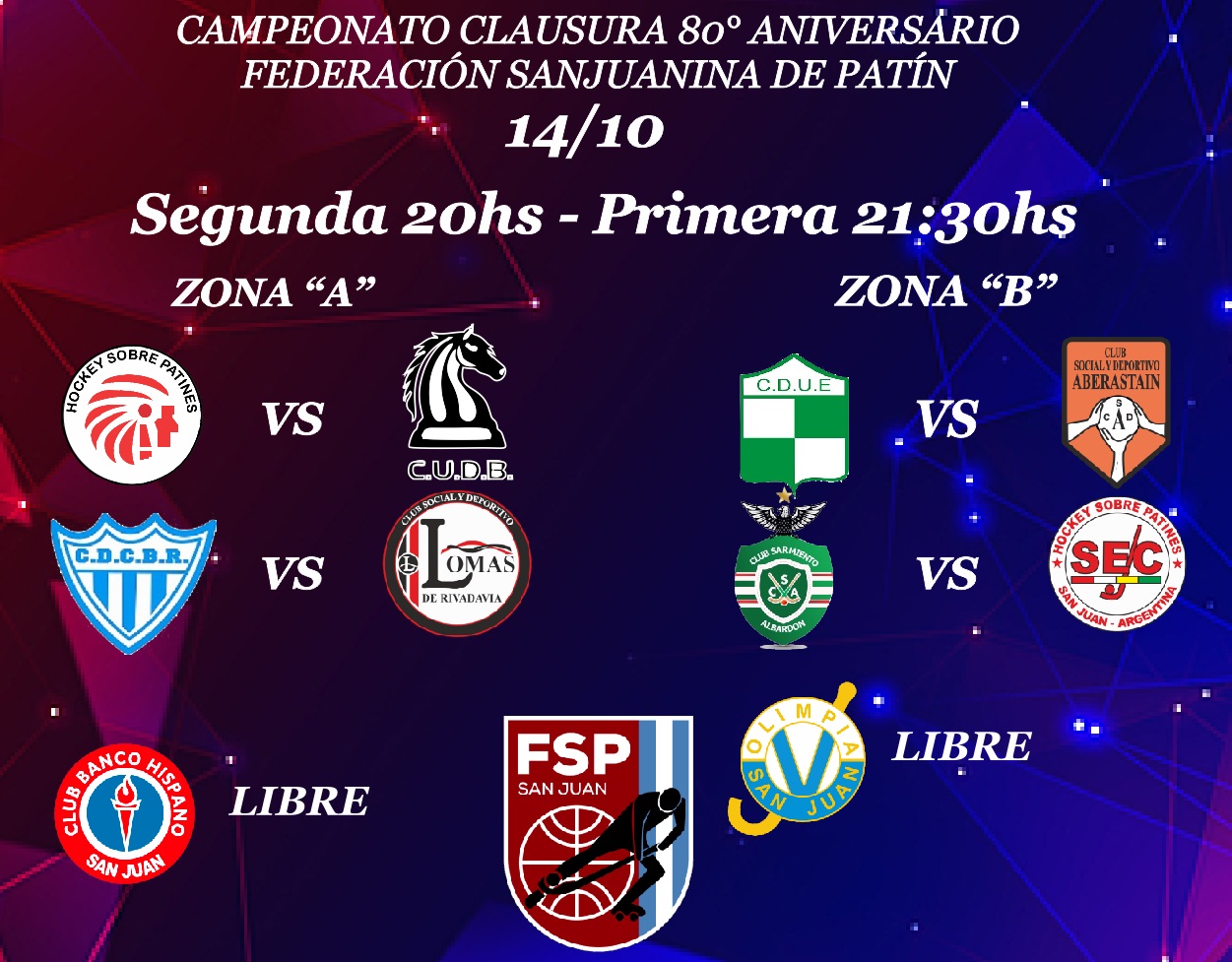 HOCKEY SOBRE PATINES Con cuatro partidos continua el Clausura de Hockey EDITOR 12 de octubre de 2022 Este miércoles se juega la segunda fecha en la Zona C y D, mañana será el turno de la zona A y B. Navegación de entradas Anterior: La actividad escolar será normal; se justificará la inasistencia a quienes no puedan acudir por el paroSiguiente: Operativos atención UDAI Rawson Más historias HOCKEY SOBRE PATINES Concepción Patín Club campeón del Torneo Cecilio Velázquez EDITOR 3 de marzo de 2026 HOCKEY SOBRE PATINES Argentina confirmó los convocados de sus cuatro equipos para el Panamericano de Selecciones – San Juan 2025 EDITOR 10 de noviembre de 2025 HOCKEY SOBRE PATINES Sin categoría Fixture completo para el Campeonato Panamericano de Clubes – San Juan 2025 EDITOR 29 de octubre de 2025