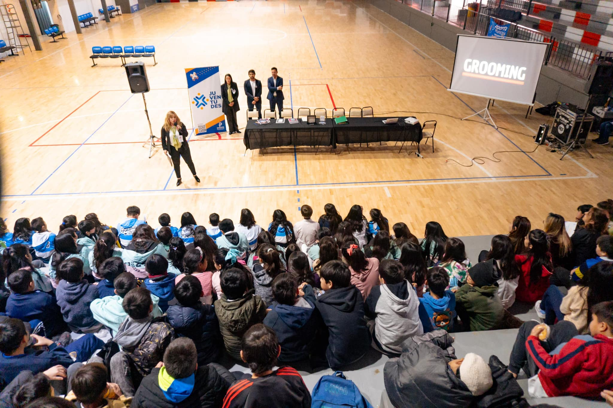 El 📍Estadio Marcelo García fue el escenario de la charla-taller🗣️ de concientización sobre Grooming🖥️, donde más de 200 alumnos de escuelas primarias, jóvenes, padres y docentes se reunieron para aprender y reflexionar sobre este tema.