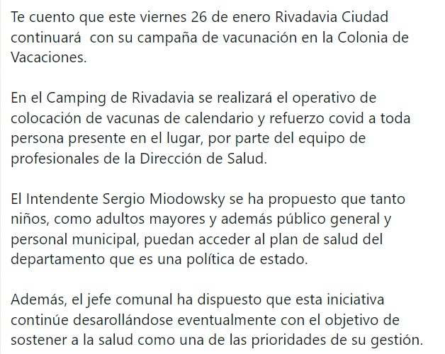 RIVADAVIA Continúa la Campaña de Vacunación EL REPORTERO 26 de enero de 2024 TRABAJEMOS JUNTOS! Navegación de entradas Anterior: El gobernador Marcelo Orrego recibió a la secretaria de Minería de la Nación, Flavia RoyónSiguiente: Festival Aires de la Quebrada! Más historias RIVADAVIA Seguimos avanzando para mejorar la calidad de vida de nuestros vecinos EL REPORTERO 30 de abril de 2026 RIVADAVIA Rivadavia informa cómo funcionarán los servicios durante el fin de semana largo EL REPORTERO 30 de abril de 2026 RIVADAVIA Con recursos propios Sergio Miodowsky inauguró el agua potable en el Faunístico EL REPORTERO 29 de abril de 2026