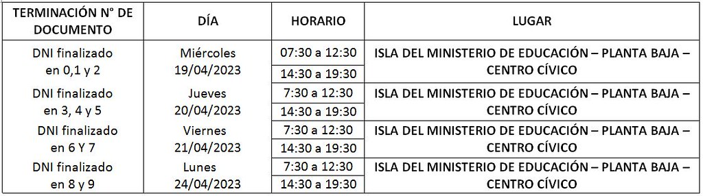 El Ministerio de Educación informa que las personas que poseen Contratos Administrativos de Servicios de Colaboración, deberán presentar la Factura Electrónica correspondiente a abril 2023 a su directivo para que la misma sea firmada y sellada al dorso. La factura podrá realizarse a partir del 18 de abril y deberá ser presentada en el Centro Cívico de acuerdo al siguiente cronograma
