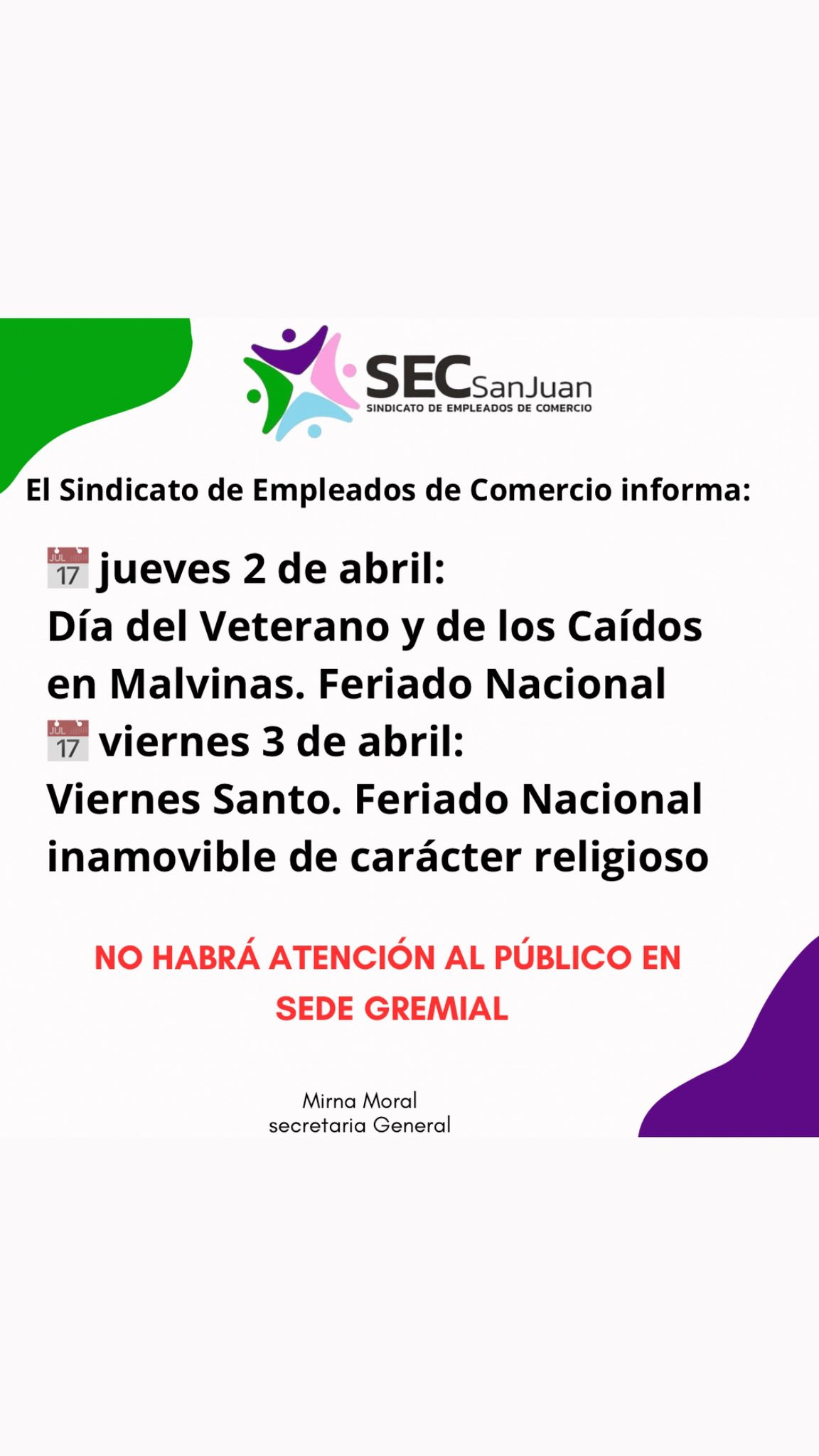 SINDICAL El Sindicato Empleados de Comercio te informa EL REPORTERO 3 de abril de 2026 Feriados jueves y viernes mes de abril. Navegación de entradas Anterior: Súmate a nuestros equiposSiguiente: Rendimos homenaje a nuestros «Héroes» Más historias SINDICAL Día Mundial de la Seguridad y la Salud en el Trabajo EL REPORTERO 28 de abril de 2026 DESTACADO SINDICAL ¡Atención! Homologaron el acuerdo salarial de abril 2026 EL REPORTERO 28 de abril de 2026 SINDICAL ¡Se viene el gran festejo del Día del Trabajador! EL REPORTERO 27 de abril de 2026