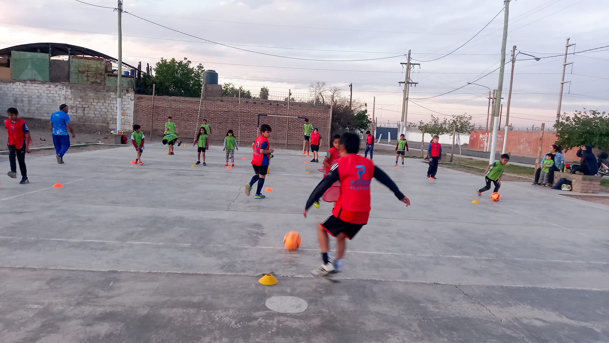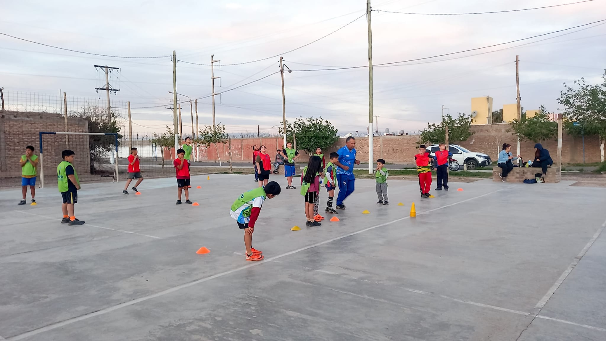 En el Playón del Barrio Los Girasoles, chicos de 5 a 12 años practican Futsal junto al profesor Fernando Castro.