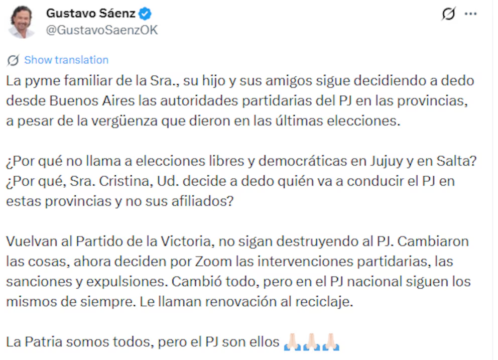 Gustavo Sáenz volvió a criticar a Cristina Kirchner por la conducción del PJ: “La Pyme familiar de la Sra.”