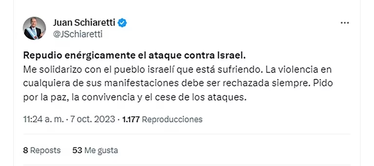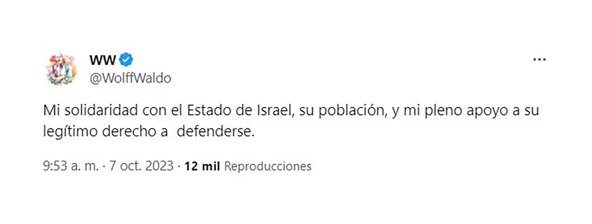El secretario de Asuntos Públicos del gobierno porteño, Waldo Wolff expresó su consternación por la situación. “Mi solidaridad con el Estado de Israel, su población, y mi pleno apoyo a su legítimo derecho a defenderse”, publicó en su cuenta personal de la red social X. Wolff tiene familiares directos en la zona de conflicto. Desde hace dos años, su hijo, Marco Wolff, es arquero en el club de fútbol de primera división, el Maccabi Petah Tikva.