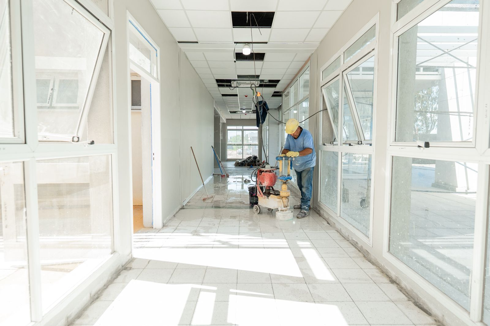 En esta etapa se ejecutan tareas de pintura y terminaciones, pulido fino y lustrado de pisos, colocación de equipamiento técnico, ajustes en instalaciones eléctricas, sanitarias y de gases médicos, además del montaje de carpinterías y divisiones interiores.