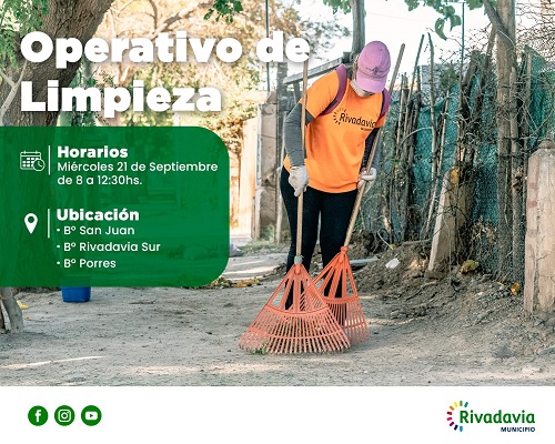 En esta oportunidad estaremos en dos frentes simultáneamente realizando un nuevo operativo integral de limpieza esto se realizará mañana miercoles 21, de 8 a 12 horas en Marquesado, en Barrio Cerro Blanco, Lote Hogar Nº 53, Barrio Marquesado III y Villa Chacabuco y en la zona Sur, , en los Barrios San Juan, Rivadavia Sur y Porres.