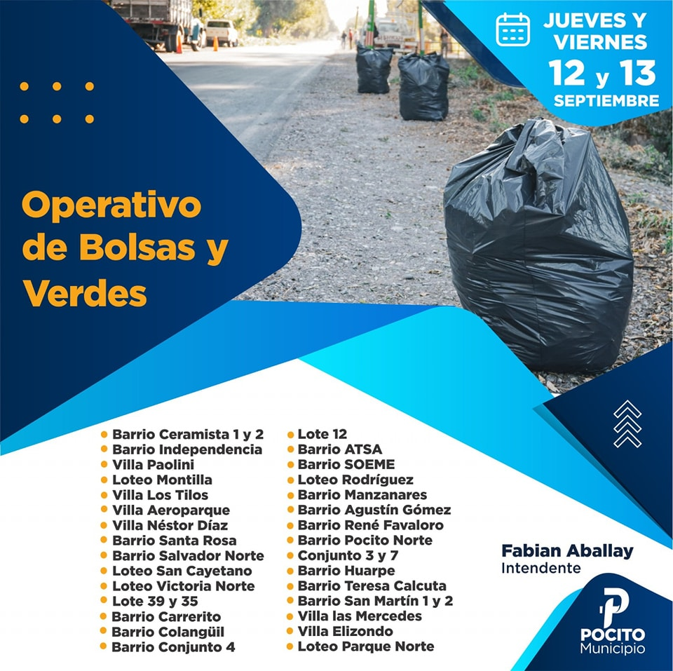 Este viernes 13 de Septiembre, los Operativos de Bolsas y Verdes, Limpieza Integral🍂, Desmalezamiento de Plazas se llevarán a cabo en los siguientes puntos de 📍Zona Norte.