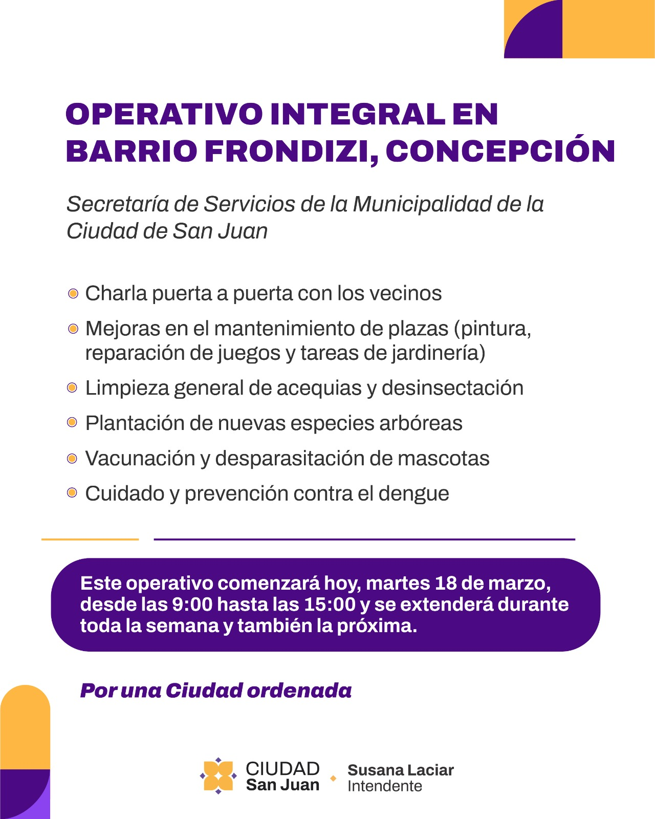 La Municipalidad de la ciudad de San Juan promoviendo el cuidado de la infraestructura verde del departamento organizó un operativo integral este martes 18 de marzo en el barrio Frondizi, sector de Concepción.