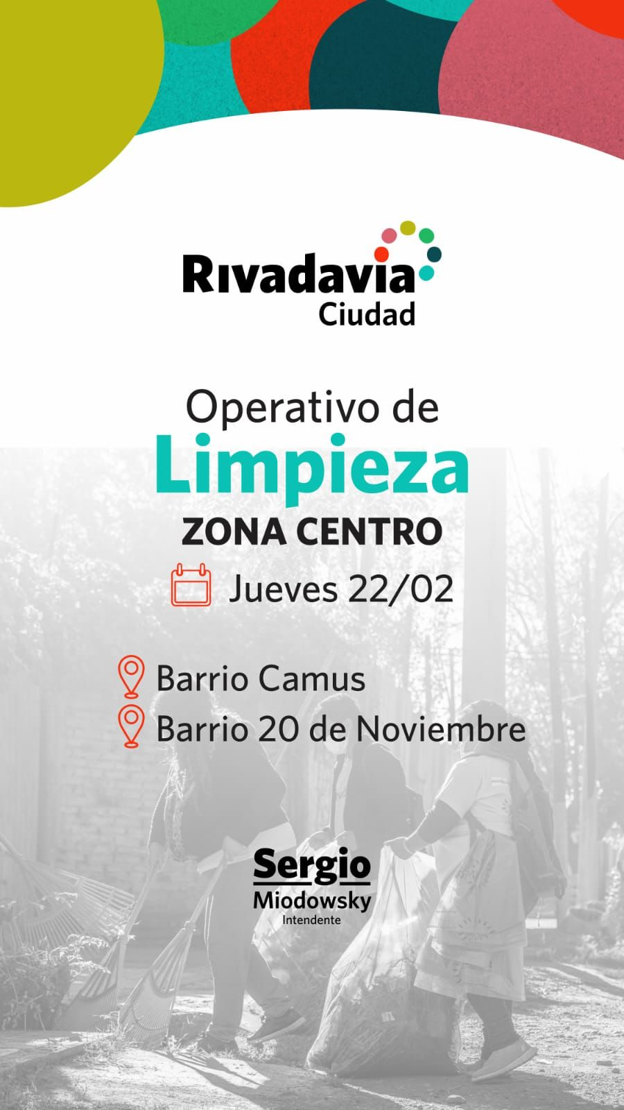 Mientras que para el jueves 22 de febrero, se procederá también a un operativo especial pero en este caso, en la zona centro de Rivadavia, que abordará el Barrio Camus y el Barrio 20 de noviembre.