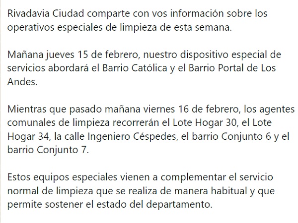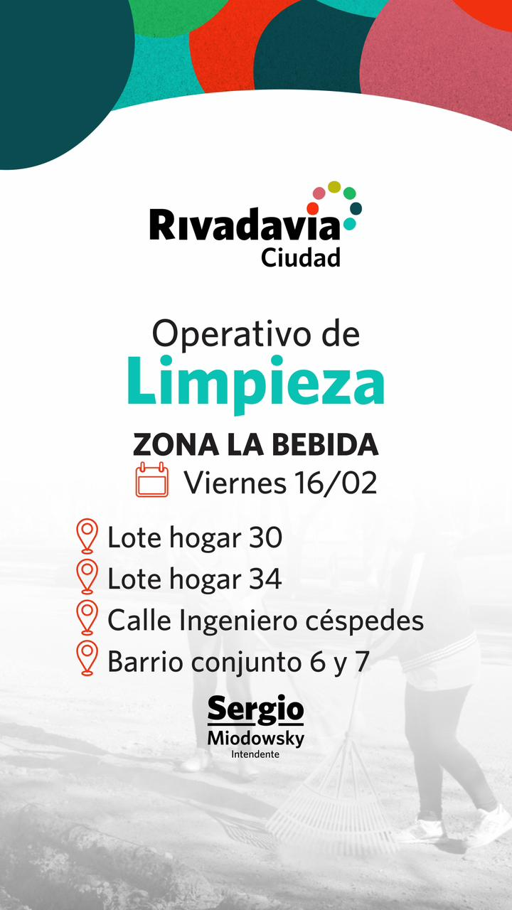 RIVADAVIA Operativos de limpieza EL REPORTERO 14 de febrero de 2024 TRABAJEMOS JUNTOS! Navegación de entradas Anterior: Capacitan en RCP a los instructores de las Escuelas Deportivas de PocitoSiguiente: ¡Los chicos empiezan las clases con sus kits escolares! Más historias RIVADAVIA Seguimos avanzando para mejorar la calidad de vida de nuestros vecinos EL REPORTERO 30 de abril de 2026 RIVADAVIA Rivadavia informa cómo funcionarán los servicios durante el fin de semana largo EL REPORTERO 30 de abril de 2026 RIVADAVIA Con recursos propios Sergio Miodowsky inauguró el agua potable en el Faunístico EL REPORTERO 29 de abril de 2026