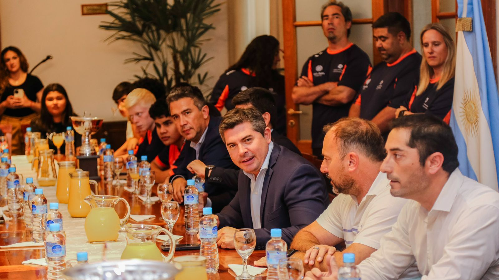 Acompañaron al primer mandatario provincial el ministro de Turismo, Cultura y Deporte, Guido Romero; y el secretario de Deportes, Pablo Tabachnik y parte de su equipo. La delegación de deportistas estuvo integrada además por los profesores que participaron de los juegos y algunos padres y madres de los participantes.