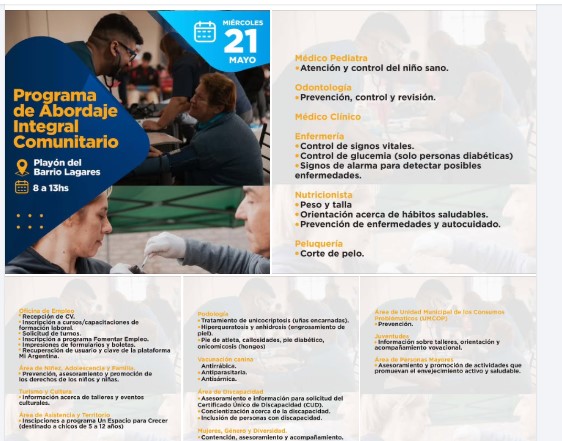 El miércoles 21 de mayo, a partir de las 8hs, el Playón del Barrio Lagares, será sede de un nuevo Programa de Abordaje Integral Comunitario.