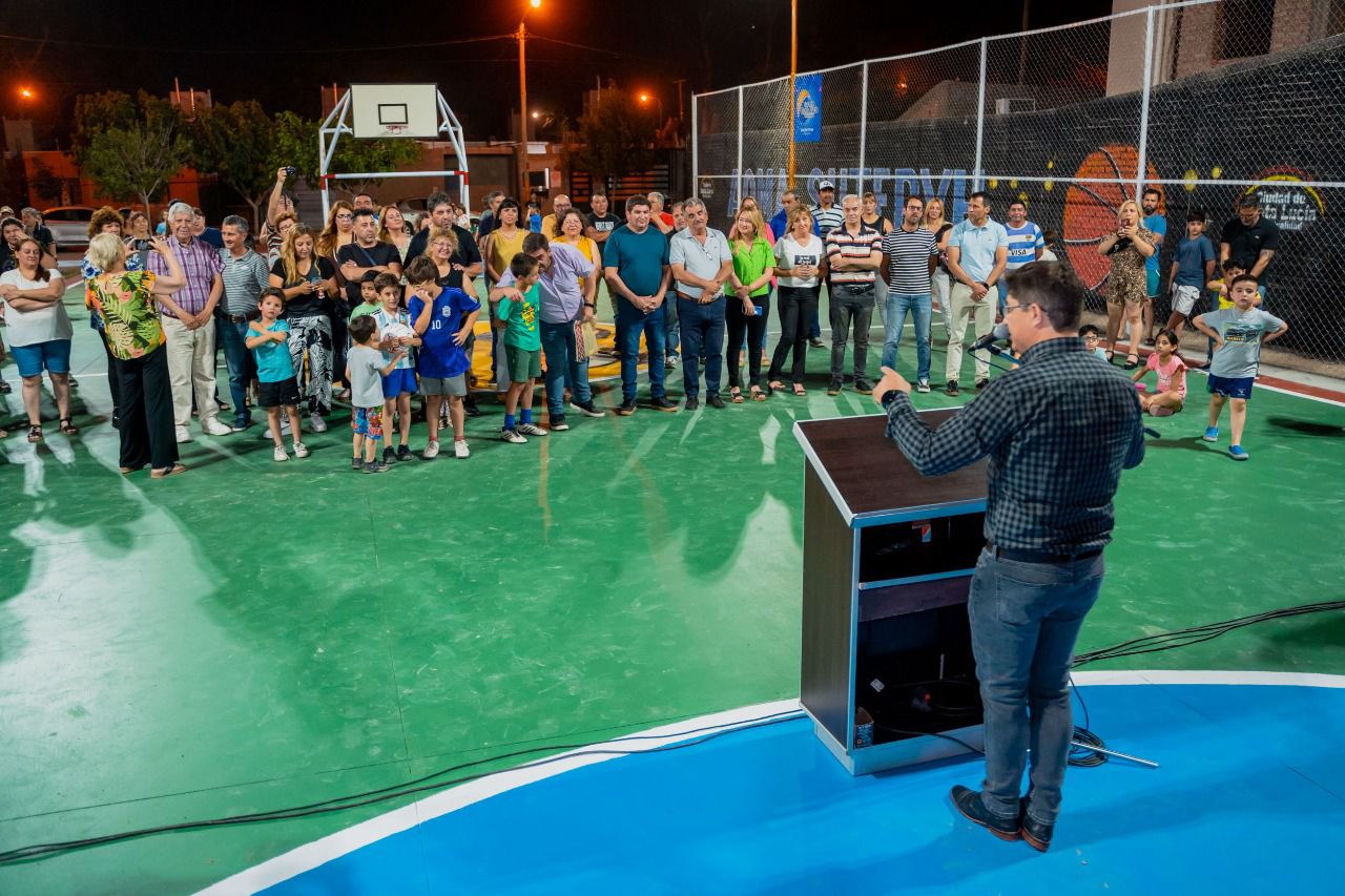 El Intendente Juan José Orrego, en compañía del equipo municipal de Santa Lucía y muchos vecinos que se acercaron a conocer su nuevo multiespacio, inauguró el playón deportivo en el barrio AOMA SUTERYH. Se trata de un predio recuperado que cuenta con canchas con pintura de alto impacto, aros y arcos para
