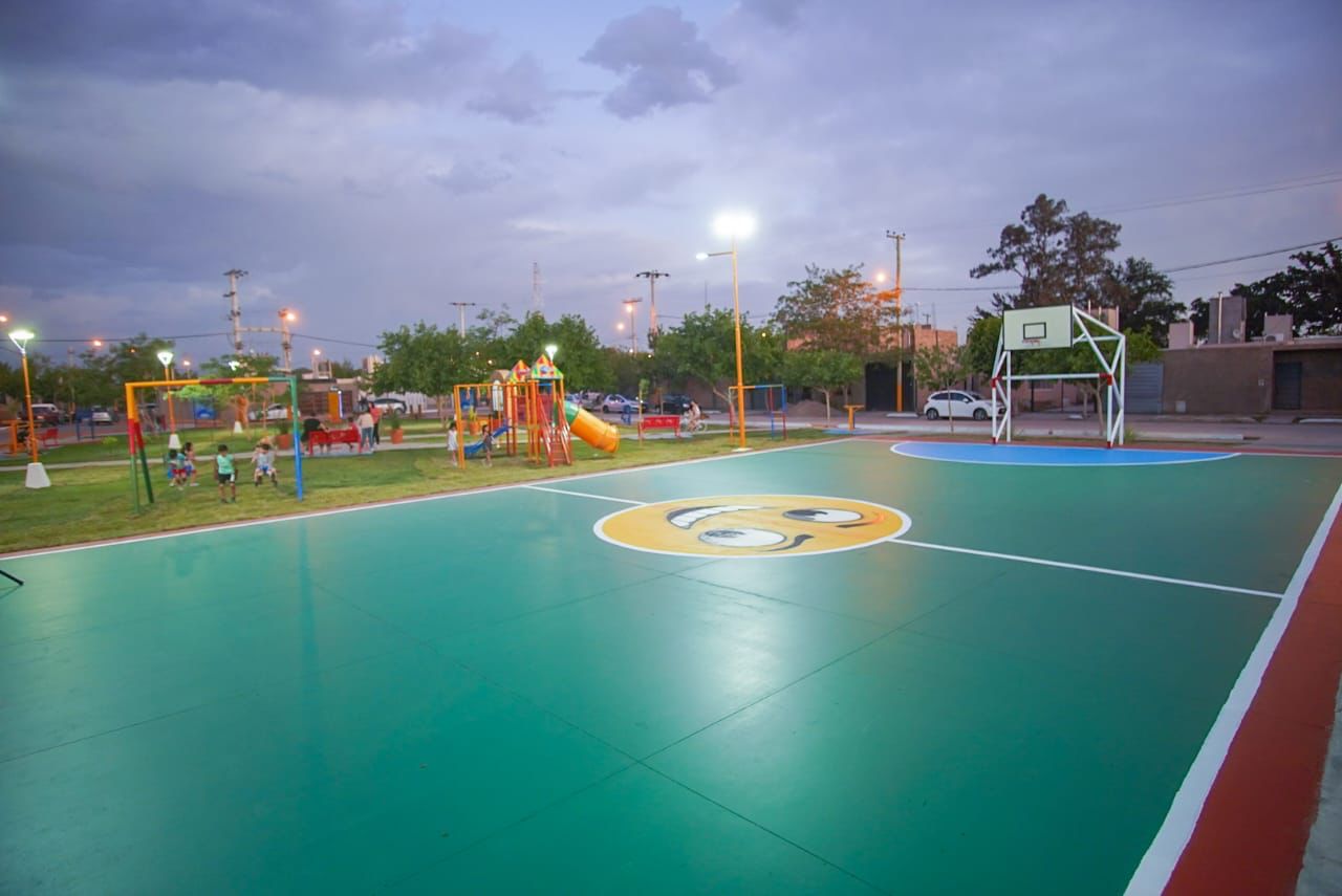 El predio, de 15m. de largo por 30 m. de ancho, posee nuevas luminarias LED: cuatro columnas telescópicas que permiten practicar deportes durante las noches sin ningún problema. Además, se pintaron murales artísticos que le dan una nueva vida al lugar.