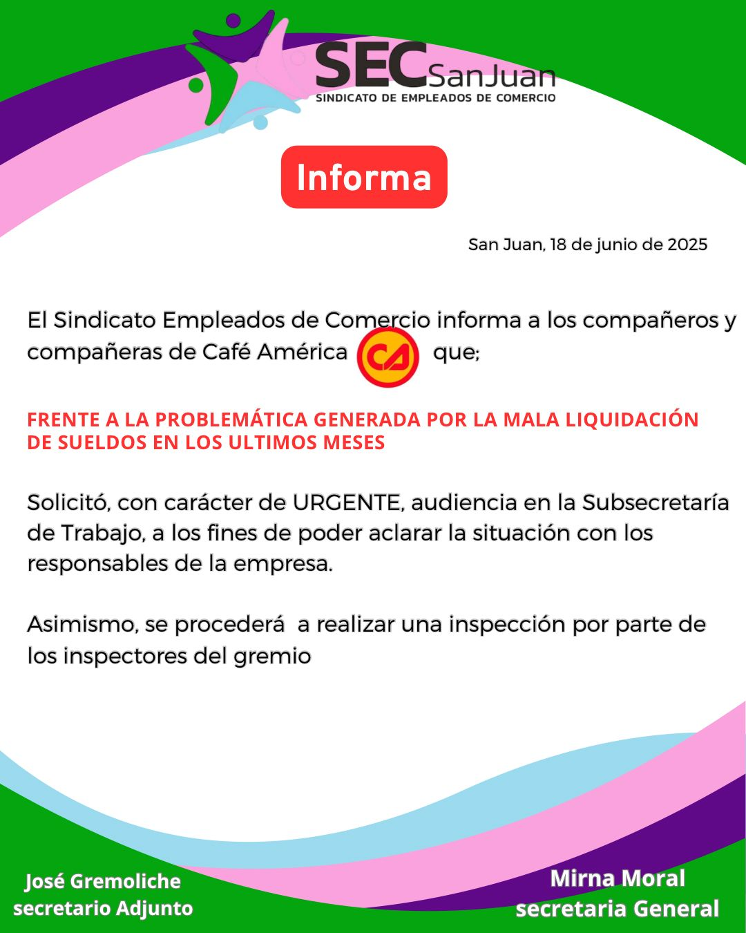 El Sindicato Empleados de Comercio, realizó una inspección en las distintas sucursales de Café América, como consecuencia del reclamo de los compañeros por diferencias salariales y descuentos.