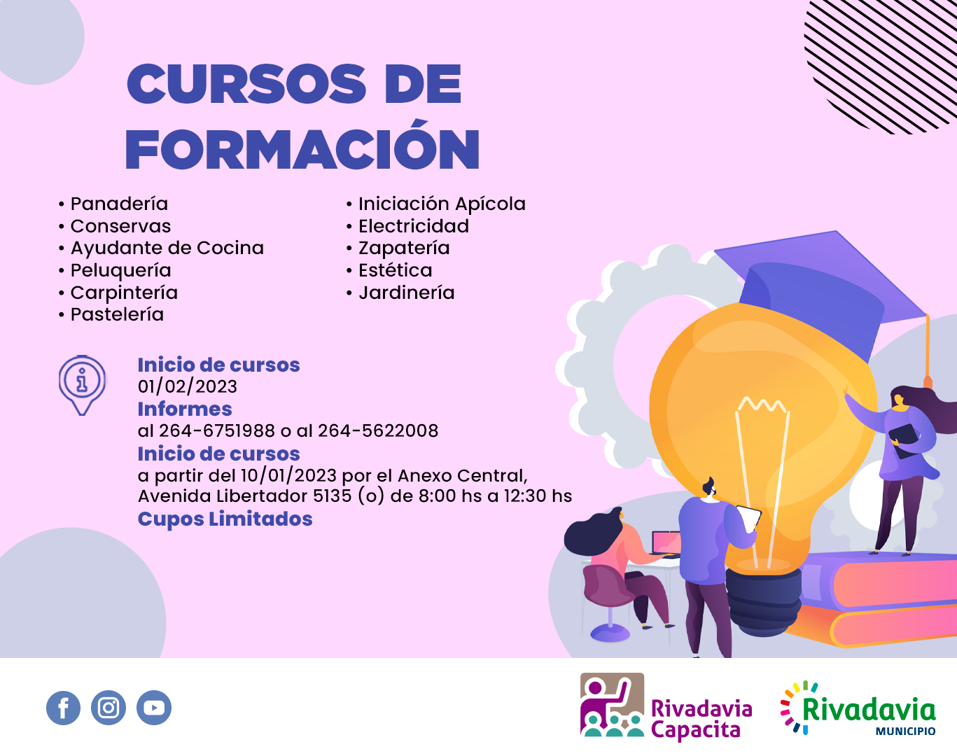A partir del 10 de enero habilitamos las inscripciones para los diferentes cursos de formación y capacitación de nuestra escuela laboral “Rivadavia Capacita”.