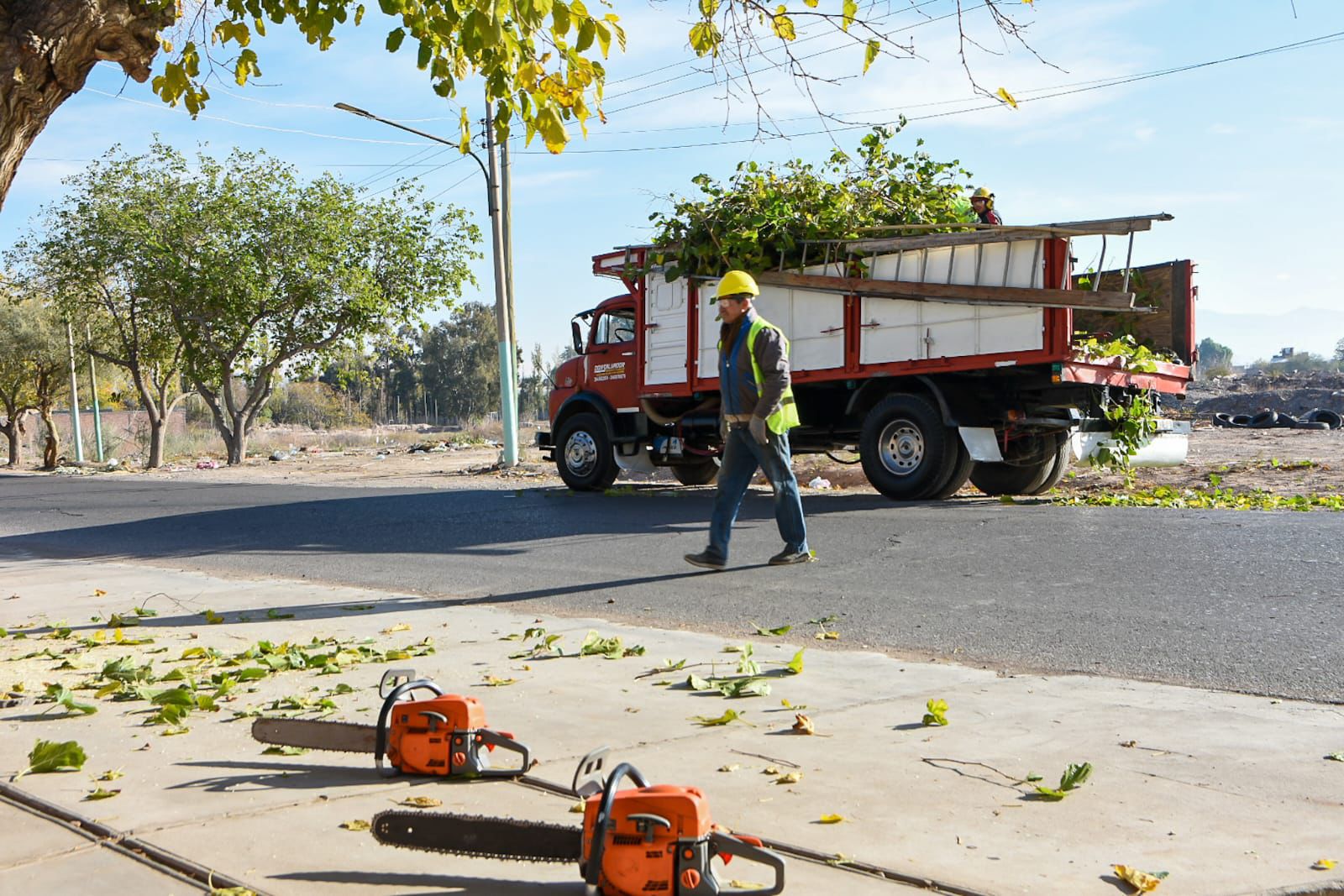 En la recorrida se observó a los agentes al servicio del municipio con equipos de corte, equipos de levante, camiones e hidrogrúa, además de indumentaria identificativa y carteleria vial orientativa.