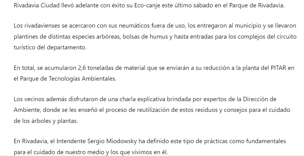 RIVADAVIA Rivadavia recuperó más de dos toneladas de neumáticos fuera de uso EL REPORTERO 29 de enero de 2024 TRABAJEMOS JUNTOS! Navegación de entradas Anterior: Rivadavia Vuelve al ColeSiguiente: Sucedió un día como hoy Más historias RIVADAVIA Feria de Artesanos y Emprendedores EL REPORTERO 19 de abril de 2026 RIVADAVIA Recibimos a los campeones con el orgullo que se merecen EL REPORTERO 19 de abril de 2026 RIVADAVIA Campeonato Sanjuanino de Automovilismo EL REPORTERO 19 de abril de 2026