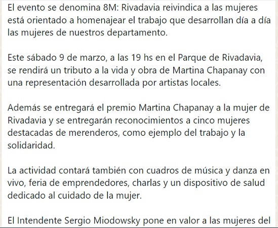 RIVADAVIA Rivadavia reivindicará a las mujeres EL REPORTERO 8 de marzo de 2024 TRABAJEMOS JUNTOS! Navegación de entradas Anterior: El intendente Sergio Miodowsky compartió el 8M con las mujeres de RivadaviaSiguiente: Con una gala de poesía y música se llevó a cabo el inicio de la agenda de actividades por el Mes de la Mujer Más historias RIVADAVIA Rivadavia avanza con más obras: nuevas veredas en Barrio Del Bono Green EL REPORTERO 22 de abril de 2026 RIVADAVIA Celebramos el Mes de la Madre Tierra con una jornada pensada para disfrutar en comunidad EL REPORTERO 21 de abril de 2026 RIVADAVIA Rivadavia Activa en tu barrio EL REPORTERO 21 de abril de 2026