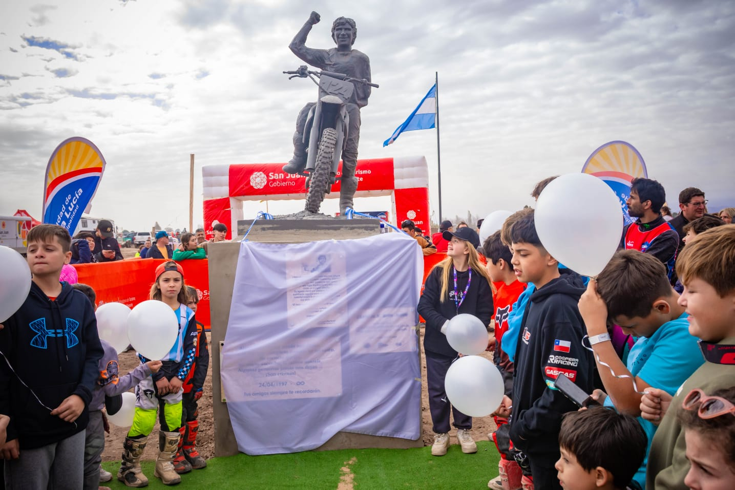 El momento más emotivo de la jornada se vivió con la inauguración de una estatua en homenaje al recordado piloto sanjuanino Alberto «Wey» Zapata, cuyo legado quedó inmortalizado en el corazón del nuevo circuito. El acto fue encabezado por el intendente Juan José Orrego, quien destacó el valor simbólico y deportivo de este homenaje: “El Wey es un ejemplo de lucha y pasión por este deporte. Este espacio lleva su nombre y su espíritu en cada salto”.
