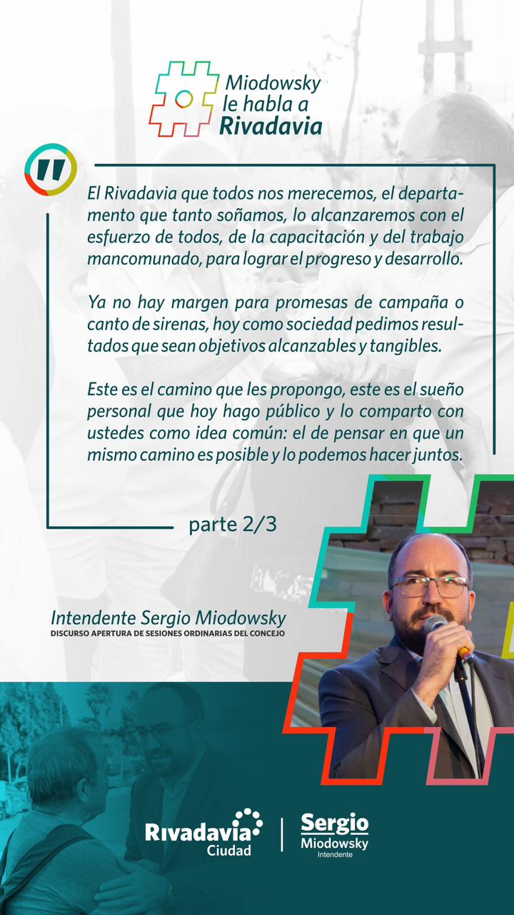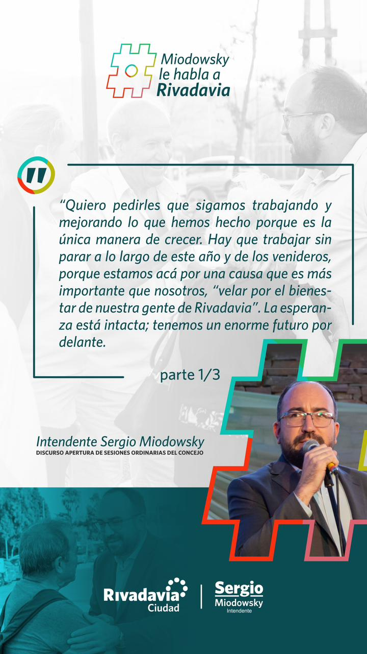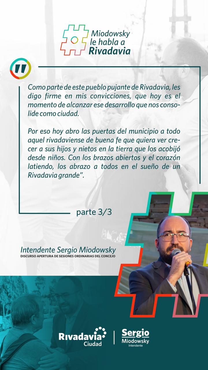 RIVADAVIA Sigamos trabajando y mejorando Rivadavia EL REPORTERO 8 de marzo de 2024 El intendente del departamento de Rivadavia, en la provincia de San Juan, Sergio Miodowsky, en su mensaje, fue claro con los habitantes de Rivadavia. Navegación de entradas Anterior: Miodowsky: lo que se hizoSiguiente: Marcelo Orrego: «la reunión fue muy fructífera» Más historias RIVADAVIA Rivadavia avanza con más obras: nuevas veredas en Barrio Del Bono Green EL REPORTERO 22 de abril de 2026 RIVADAVIA Celebramos el Mes de la Madre Tierra con una jornada pensada para disfrutar en comunidad EL REPORTERO 21 de abril de 2026 RIVADAVIA Rivadavia Activa en tu barrio EL REPORTERO 21 de abril de 2026