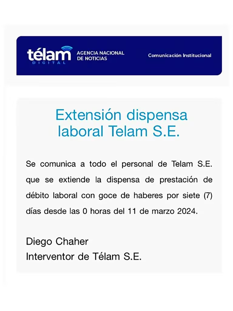 A través de un comunicado firmado por el interventor Diego Chaher, se dio a conocer la noticia de la “extensión de la dispensa laboral”. “Se comunica a todo el personal de Télam S.E que se extiende la dispensa de prestación de débito laboral con goce de haberes por siete (7) días desde las 0 horas del 11 de marzo de 2024″, indica el documento difundido.
