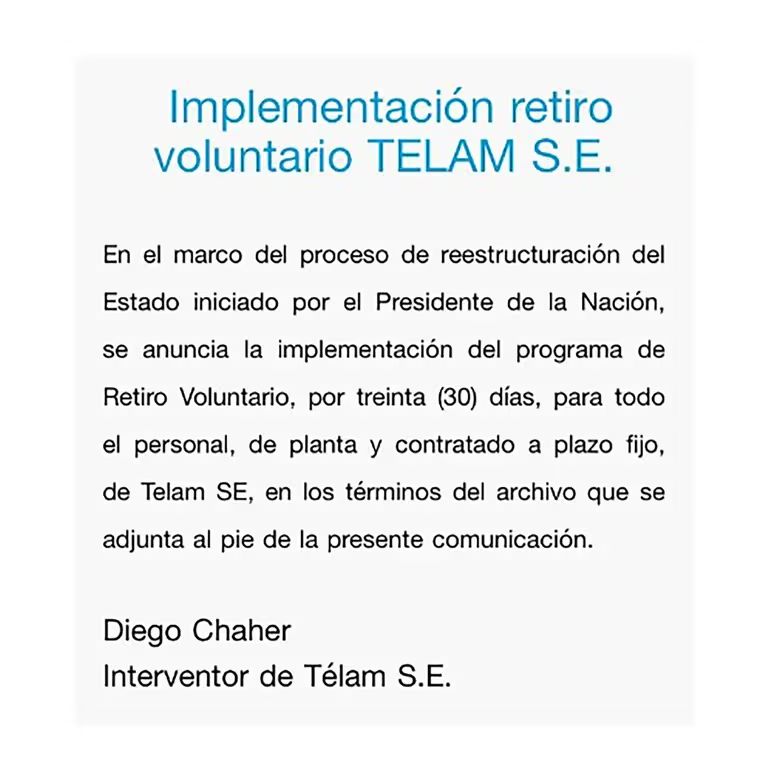 Además, se compartió otro segundo comunicado en el que se notifica a los empleados sobre la posibilidad de retirarse voluntariamente de la agencia de noticias. “En el marco de un proceso de reestructuración del Estado iniciado por el Presidente de la Nación, se anuncia la implementación del programa de Retiro Voluntario, por treinta (30) días, para todo el personal, de planta y contratado a plazo fijo, de Télam S.E, en los términos del archivo que se adjunta al pie de la presente comunicación”.
