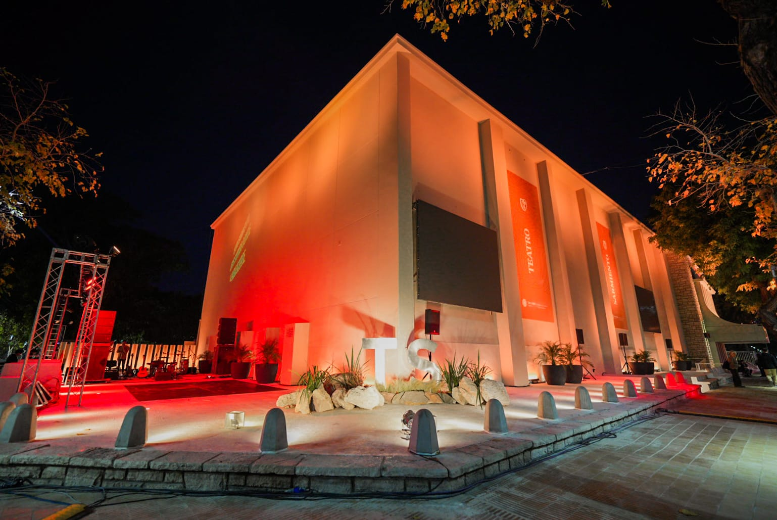Sobre las calles Alem y San Luis, se destacaron las columnas del acceso principal con una nueva iluminación que resalta la arquitectura. Se incorporaron puertas de vidrio de piso a techo para generar mayor altura, y se colocaron macetones con vegetación, aportando calidez. También se sumó una escultura con las iniciales TS, que invita a transmitir desde el exterior la energía creativa que habita en el interior del teatro.