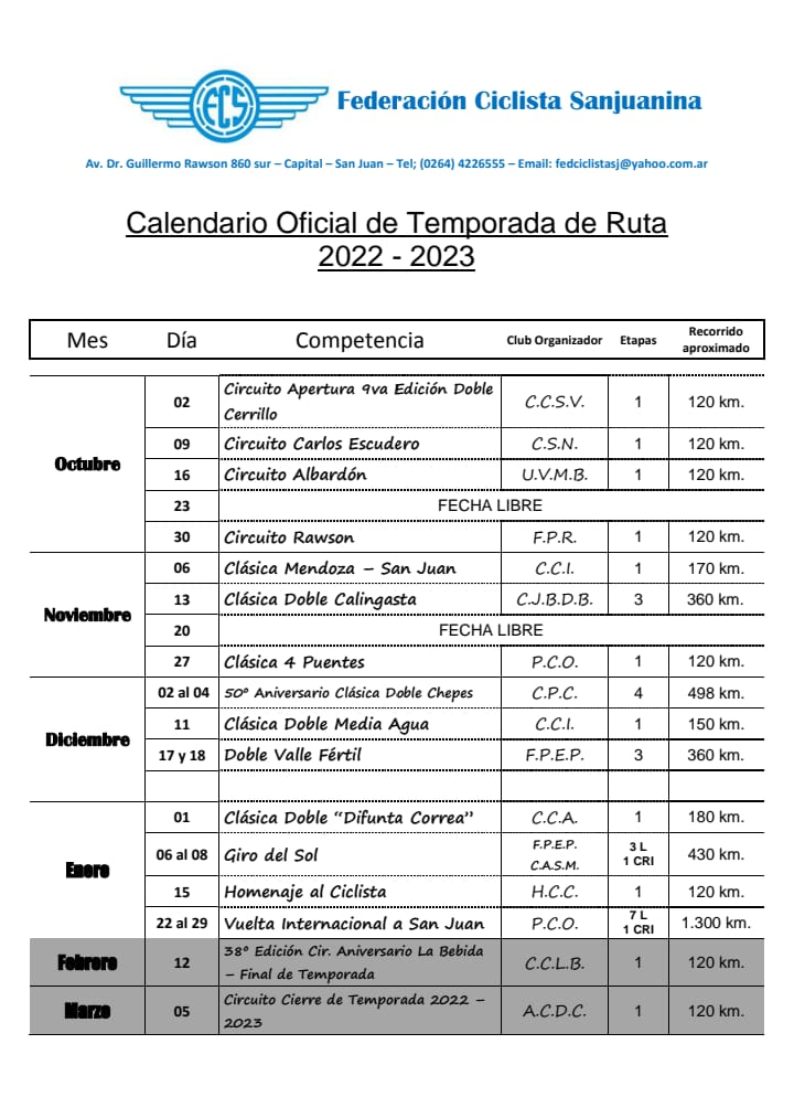A la última fecha que se corre el domingo 12 de febrero en Rivadavia en el tradicional circuito de La Bebida se le agrega una fecha de cierre de temporada el próximo 5 de marzo. Será una competencia de una etapa de 120 kilómetros