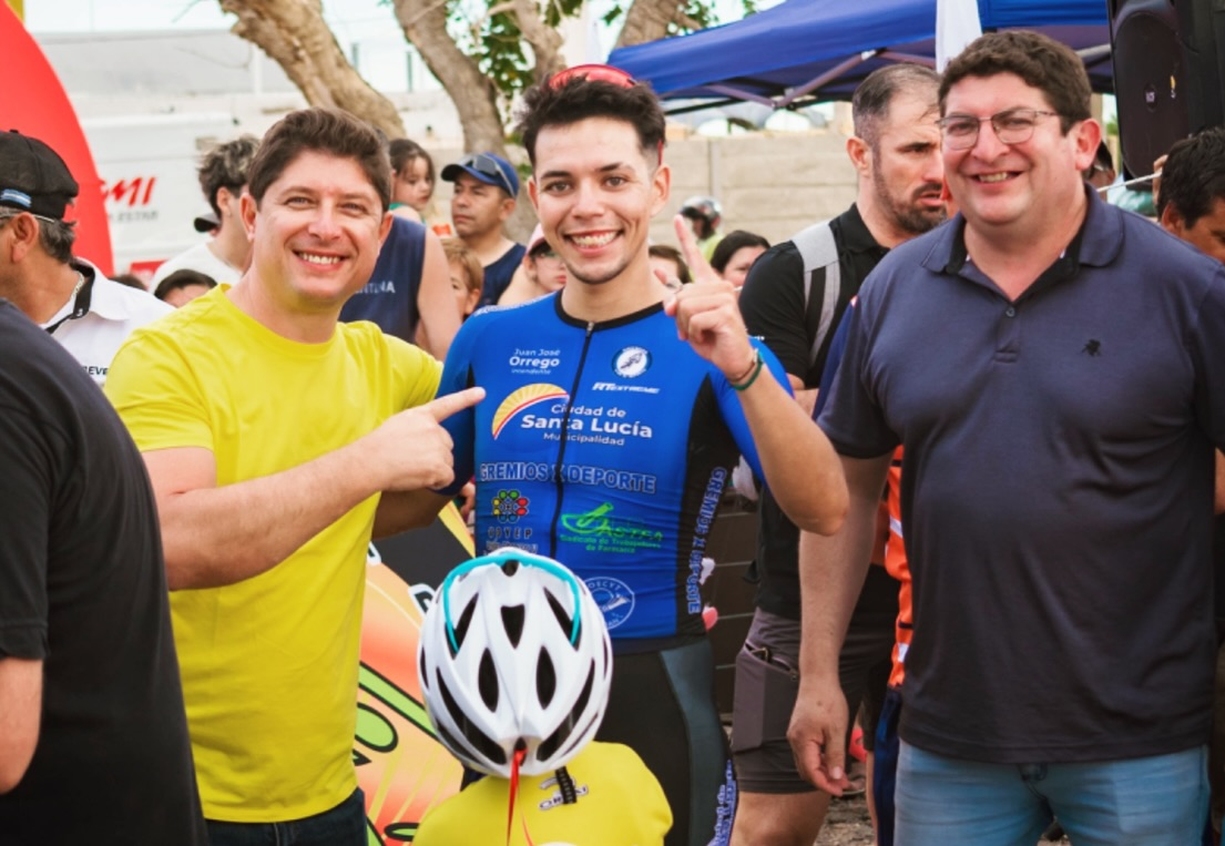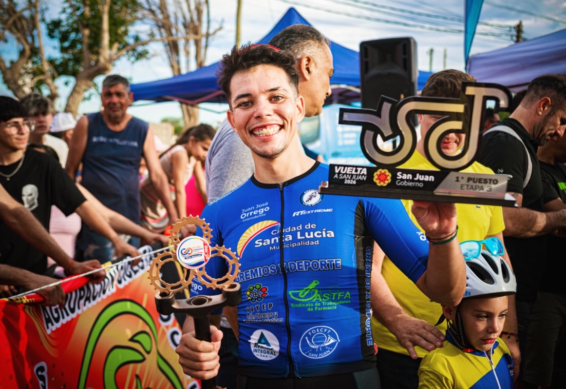 Quiero felicitar con enorme orgullo a Mauro Domínguez , del equipo Municipalidad de Santa Lucía – Gremios Unidos por el Deporte, quien supo leer la carrera, atacar en el momento justo y quedarse con la tercera etapa de la Vuelta a San Juan, en un exigente circuito de 140,9 km .